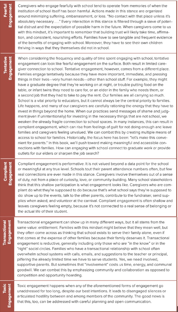 The ways that families engage with schools are widely varied based on a variety of factors. We must eradicate judgment. Indeed, one of the most powerful comments I heard in a Los Angeles workshop I facilitated for school leaders named the realization that family engagement does not need to happen at school. Sometimes the work we do to bring families into the fold aims to further engage caregivers with their students at home and in their communities. My research and methodologies in school are a journey away from fearful, tentative, compliant, transactional, and toxic engagement toward the kind of engagement that is affirming and healthier for all families.
