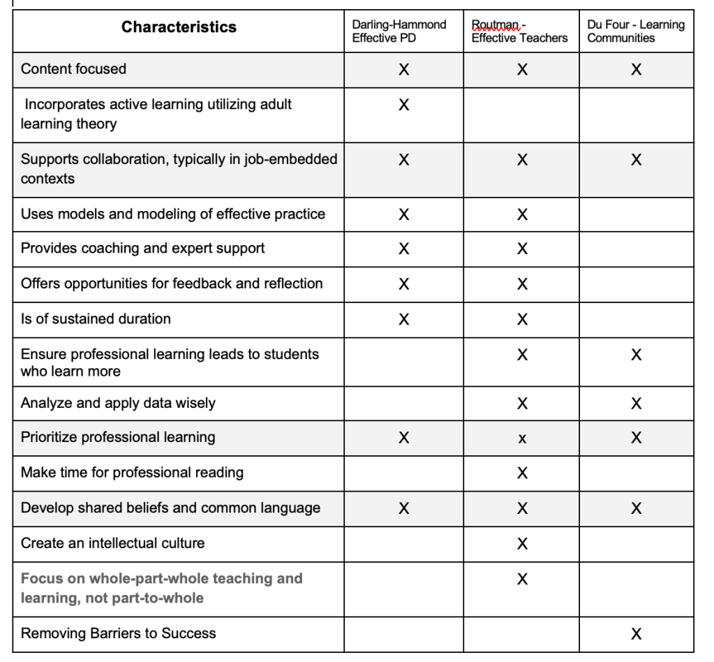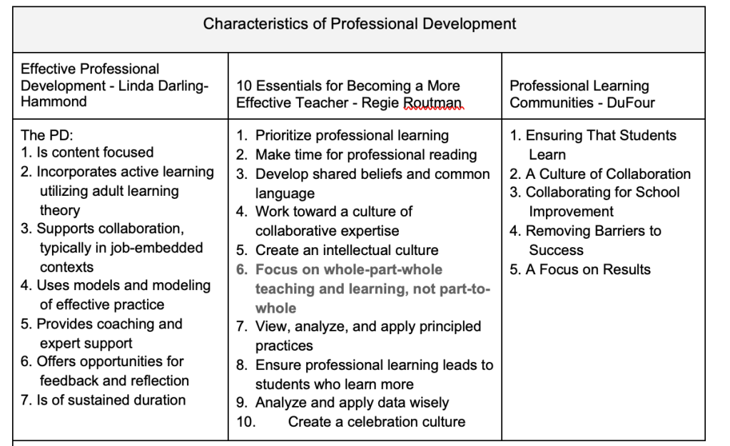Lists, lists, and more lists abound of the most important characteristics of professional development. District leaders may choose a “research-based” list without a deep study of the specifics of the research. Influences on choices may include the authors, publishers or other messages from similar topics. In a literature review, three favorites stand out because of their specificity but also because of their overlapping nature.
