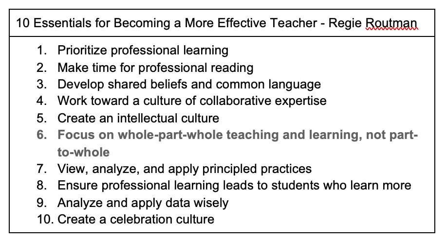 Regie Routman has decades of research in effective literacy teaching and she takes a little different view of PD in her blog post titled, “What You Need to Know about Professional Learning: 10 Essentials for Becoming a More Effective Teacher.” Regie shifted the focus to the effectiveness of the teacher. These attributes could be measured and quantified with a bit of planning (or not).